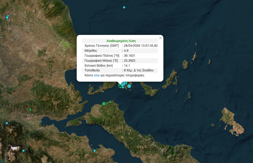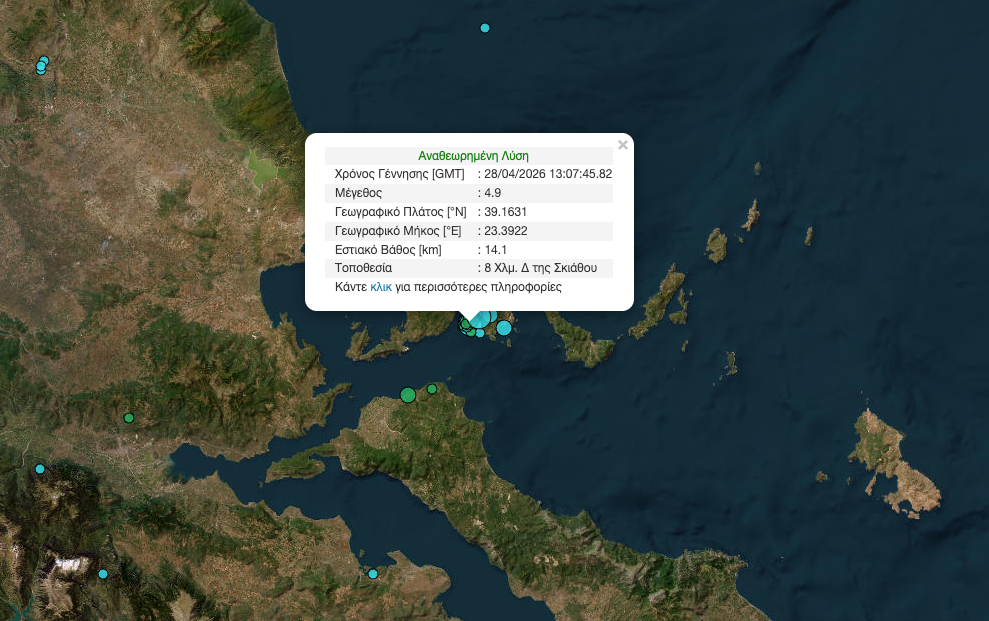 Ισχυρός σεισμός 4,9 Ρίχτερ χθες Τρίτη, στη Σκιάθο