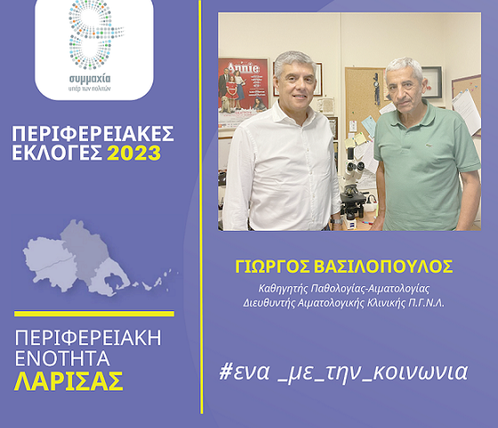 Τον Καθηγητή Παθολογίας-Αιματολογίας Γιώργο Βασιλόπουλο που κατέρχεται υποψήφιος περιφερειακός σύμβουλος στην Π.Ε. Λάρισας στις αυτοδιοικητικές εκλογές του Οκτωβρίου, καλωσόρισε ο Περιφερειάρχης Θεσσαλίας Κώστας Αγοραστός στον συνδυασμό «Συμμαχία υπέρ των πολιτών» που έχει σταθερά στο επίκεντρο τον άνθρωπο και αγωνίζεται με έργα, δράσεις, πρωτοβουλίες για μια Περιφέρεια χωρίς διακρίσεις και αποκλεισμούς.
