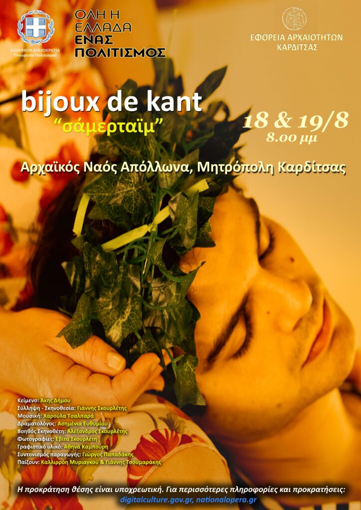 Η Εφορεία Αρχαιοτήτων Καρδίτσας, στο πλαίσιο των εκδηλώσεων του θεσμού “Όλη η Ελλάδα, ένας Πολιτισμός” φιλοξενεί την Παρασκευή 18 & το Σάββατο 19 Αυγούστου 2023, στον Αρχαϊκό Ναό του Απόλλωνα στη Μητρόπολη, την παράσταση της ομάδας bijoux de kant με τίτλο “σάμερταϊμ”.