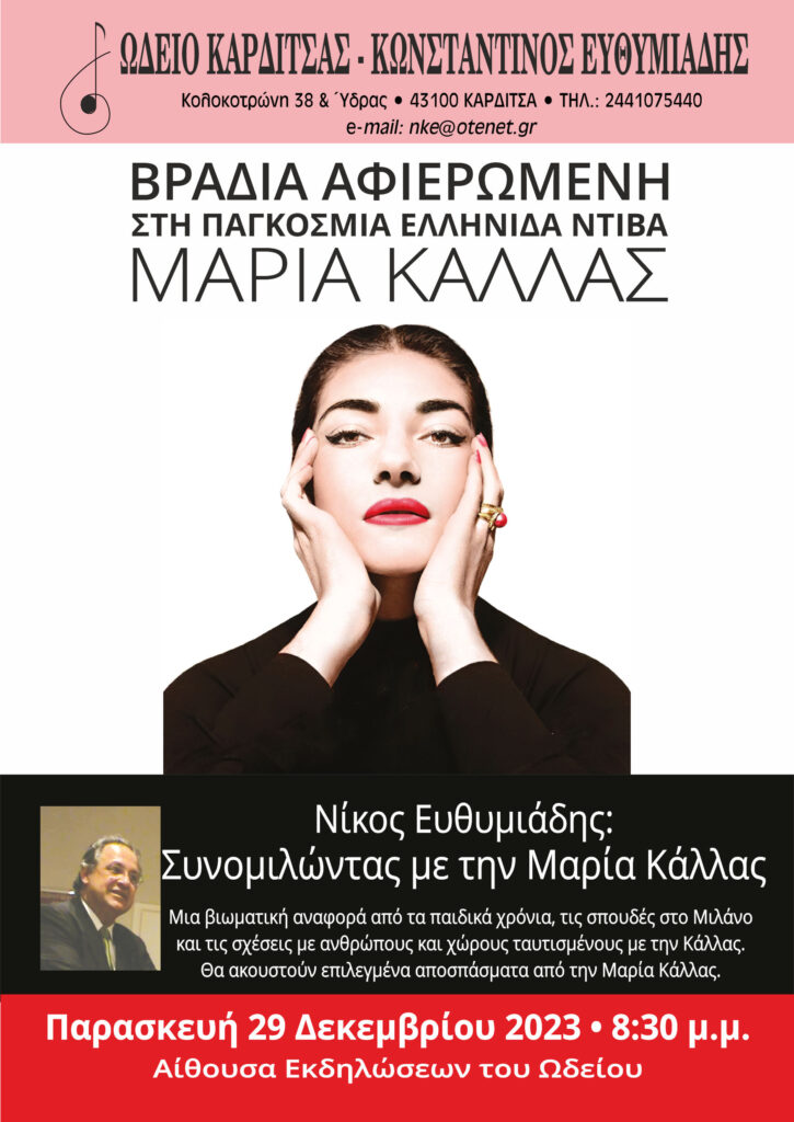 Το Ωδείο Καρδίτσας – Κωνσταντίνος Ευθυμιάδης, στο πλαίσιο του Έτους Κάλλας 2023 και στα Καρδιτσιώτικα Χριστούγεννα θα κλείσει την χρονιά με ένα σπάνιο και μοναδικό αφιέρωμα στην κορυφαία Ελληνίδα Υψίφωνο παγκοσμίων διαστάσεων, την Μαρία Κάλλας – Καλογεροπούλου (1923-1977), την οποία τιμά όλη η Υφήλιος το 2023, με την ευκαιρία της συμπλήρωσης εκατό (100) χρόνων από τη γέννησή της.