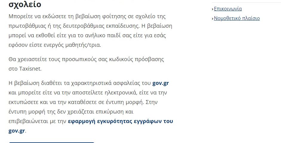 Για την έκδοση της βεβαίωσης μαθητή, οι ενδιαφερόμενοι συνδέονται με τους προσωπικούς κωδικούς πρόσβασής τους στο TaxisNet και εκδίδουν τη βεβαίωση, χωρίς να απαιτείται να συμπληρώσουν κανένα άλλο στοιχείο.