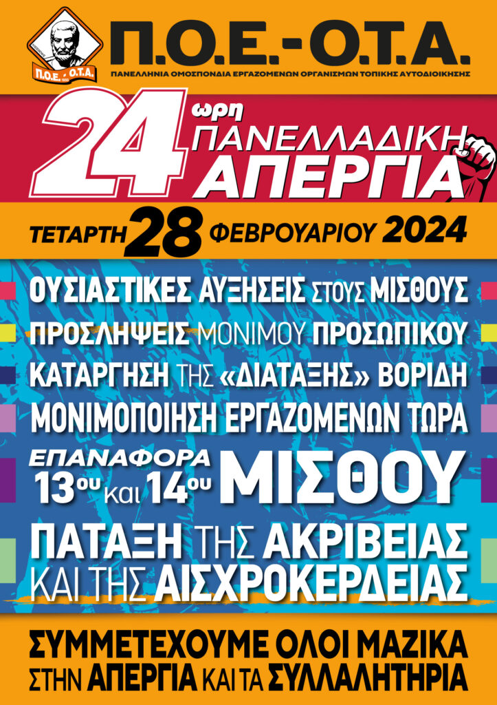 Το Δ.Σ. του Συλλόγου Εργαζομένων Ο.Τ.Α. Ν. Καρδίτσας καλεί τους εργαζόμενους στην Τοπική Αυτοδιοίκηση να συμμετάσχουν μαζικά, ενωτικά και δυναμικά στην 24ωρη Πανελλαδική Απεργία που έχει προκηρύξει η Α.Δ.Ε.Δ.Υ. για την ΤΕΤΑΡΤΗ 28 ΦΕΒΡΟΥΑΡΙΟΥ 2024, καθώς επίσης και στο Συλλαλητήριο Διαμαρτυρίας που θα γίνει στις 12:00 το μεσημέρι στην Κεντρική πλατεία της Καρδίτσας.