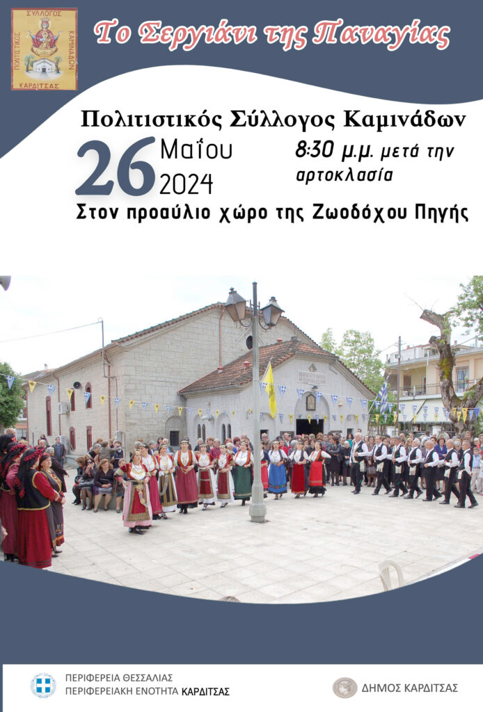 Ο Πολιτιστικός Σύλλογος Καμινάδων σας προσκαλεί στο «Σεργιάνι της Παναγίας» που θα πραγματοποιηθεί την Κυριακή 26 Μαΐου 2024 στις 20.30 στον προαύλιο χώρο της εκκλησίας Ζωοδόχου Πηγής, αμέσως μετά την αρτοκλασία.