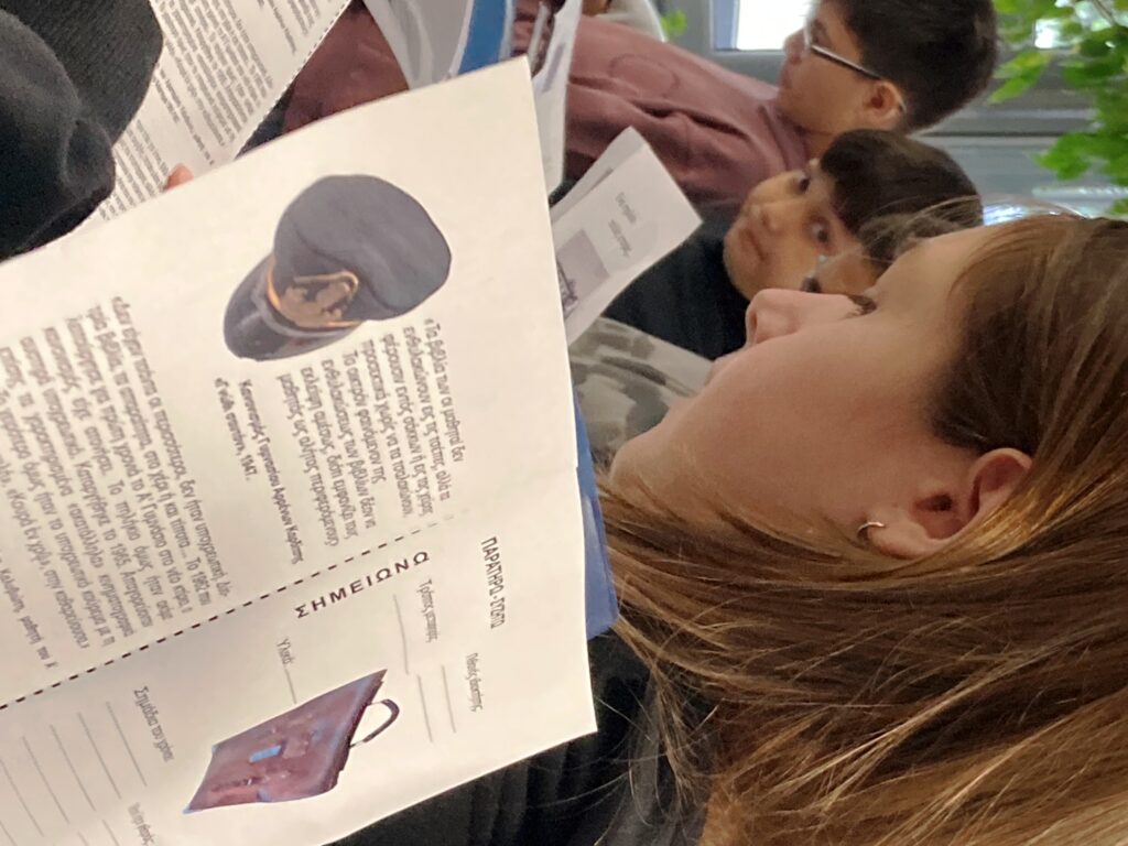 Η δράση, στην οποία συμμετείχε στο πλαίσιο της μεταπτυχιακής της εκπαίδευσης ως εξωτερική αξιολογήτρια και η φοιτήτρια του ΠΑΔΑ, Ηλιάνα Κασιούρα, είχε διάρκεια 40 περίπου λεπτά. Ένα πηλήκιο και μια σχολική σάκα έγιναν αφορμή για παρατήρηση και συζήτηση γύρω από τις ποικίλες πληροφορίες που μεταφέρουν τα μουσειακά αντικείμενα, την κοινωνία που τα παρήγαγε, την εκπαίδευση, το φύλο, τα ατομικά και συλλογικά βιώματα και τις μνήμες που συνδέονται με τα υλικά κατάλοιπα του παρελθόντος. Οι μαθητές κράτησαν τις σημειώσεις τους και συμπλήρωσαν τα πεδία ενός εκπαιδευτικού φυλλαδίου που τους διανεμήθηκε, με σκοπό αυτό να αποτελέσει υλικό επεξεργασίας και μετά το πρόγραμμα, όταν επιστρέψουν στη σχολική αίθουσα.
