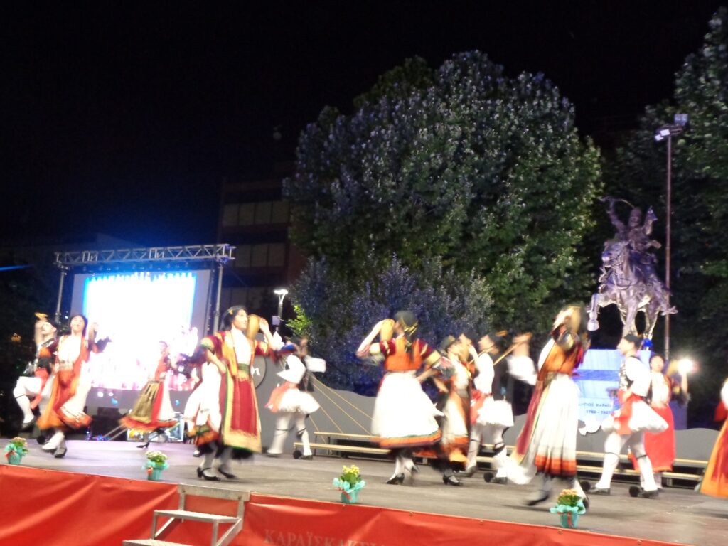 -του Προέδρου της Ένωσης Πολιτιστικών Συλλόγων Ν. Καρδίτσας Μανώλη Στεργιόπουλου, ο οποίος είπε, μεταξύ άλλων, «Αφιερωμένα φέτος τα Καραϊσκάκεια στη συμφιλίωση των λαών. Πάντα ήταν. Με τους περισσότερους παραδοσιακούς χορούς να δένουν τον κύκλο της ζωής. Και να σπάνε την πολεμική ζώνη που μας επιβάλλουν, να σπάνε ένα φαύλο κύκλο βίας, όπου μας σέρνουν κάποιοι άλλοι. Όχι τα νέα παιδιά που βλέπετε να συμμετέχουν εδώ, όχι τα παιδιά μας που θυσιαστήκαμε οι γονείς, εκπαιδευτικοί, καλλιτέχνες και ο ήρωας που αντικρίζετε κάθε χρόνο εδώ, στην πολιτιστική μας γιορτή. Η θυσία μας αποκτά νόημα σαν κάνουν δικές τους τα παιδιά τις δοκιμασμένες στο αιώνιο πέρασμα αξίες».