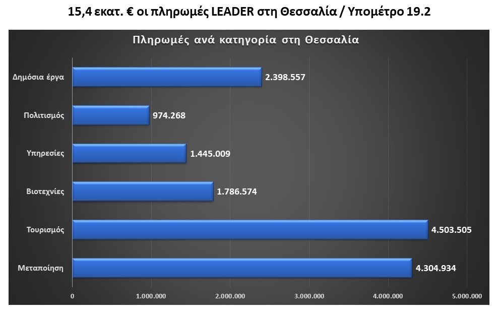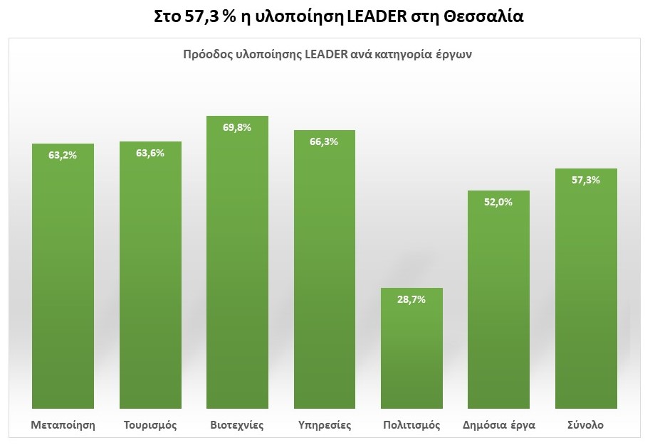 Σύμφωνα με στοιχεία των ΟΤΔ της Θεσσαλίας (Αναπτυξιακές Καρδίτσας & Τρικάλων, Αναπτυξιακοί Οργανισμοί Λάρισας & Μαγνησίας) οι συνολικές πληρωμές των ιδιωτικών και δημόσιου χαρακτήρα έργων που είναι ενταγμένα στα 4 τοπικά προγράμματα CLLD/LEADER του Προγράμματος Αγροτικής Ανάπτυξης 2014-2020 έχουν αγγίξει το 57,3% της εγκεκριμένης κατανομής και συνολικά τα 15,4 εκατ. ευρώ. Τα έργα συγχρηματοδοτούνται από το Υπουργείο Αγροτικής Ανάπτυξης & Τροφίμων και το Ευρωπαϊκό Γεωργικό Ταμείο Αγροτικής Ανάπτυξης.