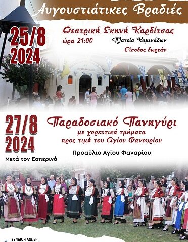 Την Τρίτη, 27 Αυγούστου 2024, μετά τον εσπερινό, θα εμφανιστούν παραδοσιακά χορευτικά τμήματα από το Σύλλογο Καμινάδων στο προαύλιο του Αγίου Φανουρίου.