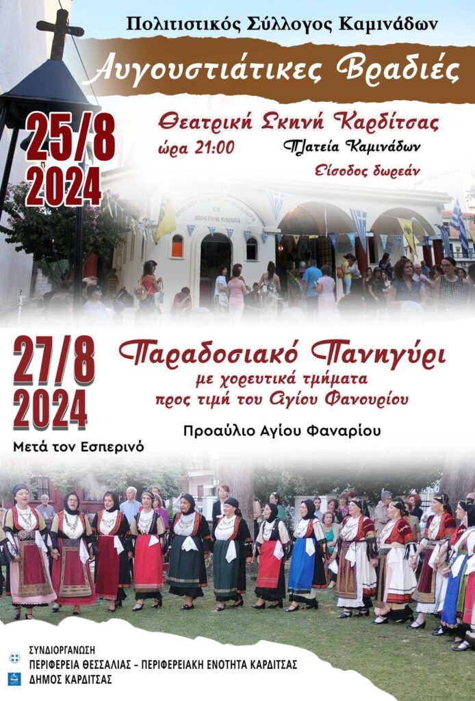 Οι εκδηλώσεις του Πολιτιστικού Συλλόγου Καμινάδων Καρδίτσας θα είναι πολυήμερες προς τιμήν του Αγίου Φανουρίου και φέτος, όπως ήταν και ξεκινούσαν από την προπαραμονή και διαρκούσαν ως και ανήμερα, παλαιότερα. Αυτές θα είναι οι εξής: Την Κυριακή, 25 Αυγούστου, στις 21:00 η “Θεατρική Σκηνή Καρδίτσας” θα παρουσιάσει δωρεάν την παράσταση “Τα καλύτερα έ(ρ)πονται”. Την Τρίτη, 27 Αυγούστου, μετά την τέλεση του μεθέορτου εσπερινού, στις 21:00μ. μ., το βράδυ, στο προαύλιο της εκκλησίας του Αγίου Φανουρίου θα εμφανιστούν παραδοσιακά χορευτικά τμήματα από το Σύλλογο Καμινάδων και, έπειτα, θα ακολουθήσει γλέντι για όλους. Την παραμονή, Δευτέρα, 26 Αυγούστου 2023, θα συμμετάσχει, με την παρουσία ατόμων από τα χορευτικά τμήματα του συλλόγου, ντυμένα, με τις παραδοσιακές ενδυμασίες της περιοχής μας και της συνοικίας και θα πλαισιώσουν την εικόνα του Αγίου. Οι χορευτές – μέλη του Συλλόγου θα στέκονται δίπλα και από τις δύο πλευρές της ιεράς Εικόνας του Αγίου από την έναρξη ως το πέρας του εόρτιου Εσπερινού. Τη Δευτέρα το πρωί, 27/08/2023, ο Σύλλογος και ο γράφοντας θα συμμετάσχει, με τη διανομή και προσφορά του υψώματος, των εορτίων κολλύβων προς τιμήν του Αγίου, της παραδοσιακής φανουρόπιτας, του παραδοσιακού γλυκίσματος της περιοχής, που είναι το λουκούμι, και αναψυκτικών.