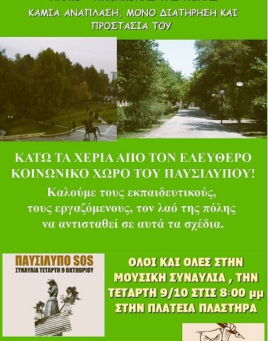 Το ΔΣ της ΕΛΜΕ Καρδίτσας εκφράζει την αντίθεσή του στα σχέδια «ανάπλασης» του Παυσιλύπου, του μεγαλύτερου πάρκου-άλσους της Καρδίτσας. Οι εκπαιδευτικοί της περιοχής μαζί με τους πολίτες της Καρδίτσας εναντιωνόμαστε στην επιχειρούμενη καταστροφική ανάπλαση που θα αλλοιώσει τον αρχιτεκτονικό και πολεοδομικό χαρακτήρα του πάρκου και της πλατείας Πλαστήρα.