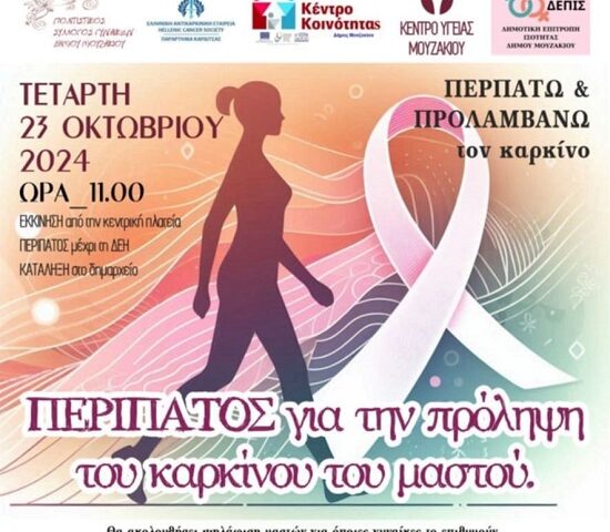 Οι φορείς του Δήμου Μουζακίου, το Κέντρο Κοινότητας και η Δημοτική Επιτροπή Ισότητας, σε συνεργασία με την Ελληνική Αντικαρκινική Εταιρία Παράρτημα Καρδίτσας, τον Πολιτιστικό Σύλλογο Γυναικών Μουζακίου και το Κέντρο Υγείας Μουζακίου, συνδιοργανώνουν δράση ενημέρωσης και ευαισθητοποίησης του κοινού για την πρόληψη του Καρκίνου του Μαστού.