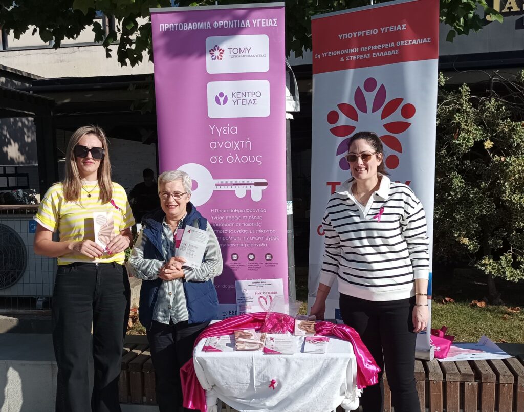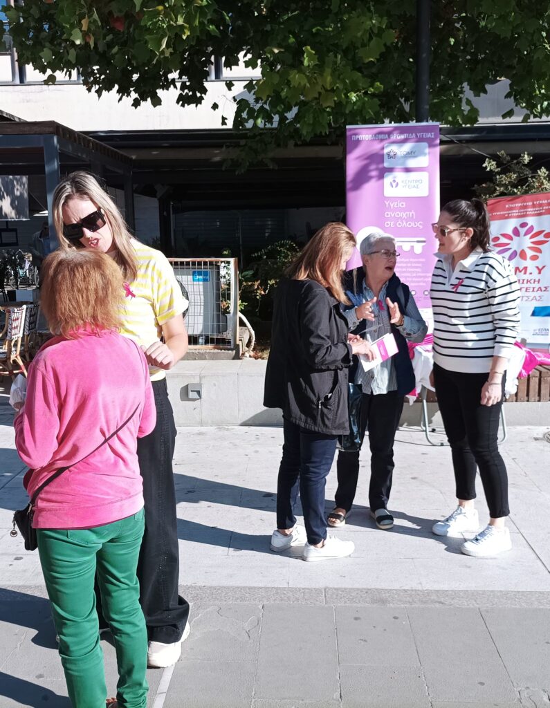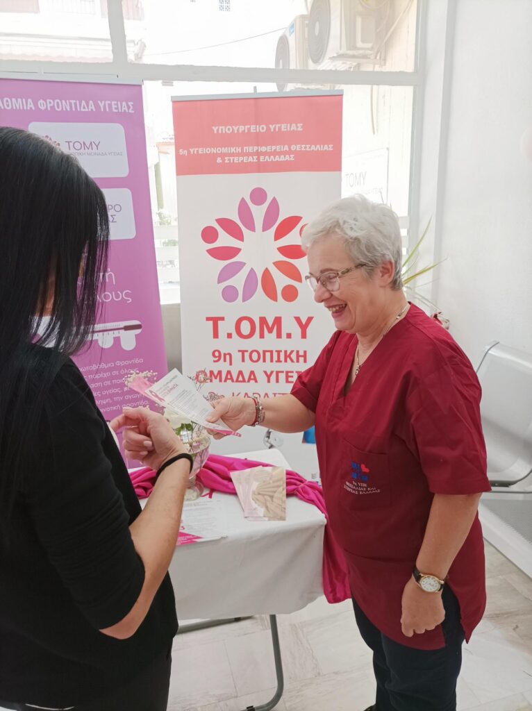 Δράσεις και πληροφορίες για το Εθνικό Πρόγραμμα Πρόληψης «ΠΡΟΛΑΜΒΑΝΩ» Ο Καρκίνος του μαστού είναι ο συχνότερος τύπος καρκίνου παγκοσμίως και υπολογίζεται πως προσβάλλει 1 στις 8 γυναίκες στον πληθυσμό. Μάλιστα κατά το έτος 2022 ο αριθμός των καταγεγραμμένων νέων διαγνώσεων ξεπέρασε τις 8.000 περιπτώσεις καθιστώντας τον καρκίνο μαστού ένα από τα νοσήματα με το μεγαλύτερο αντίκτυπο στη δημόσια υγεία. Η Πρόληψη είναι ζωτικής σημασίας καθότι επιτρέπει τον εντοπισμό του καρκίνου σε πρώιμα στάδια ή ακόμα και πριν από την εμφάνιση συμπτωμάτων και δίνει τη δυνατότητα για αποτελεσματικότερη θεραπεία και ίαση. Κάθε χρόνο σε όλο τον κόσμο ο μήνας Οκτώβριος είναι αφιερωμένος στην πρόληψη για τον καρκίνο μαστού. Πολλοί δημόσιοι και ιδιωτικοί φορείς καθώς και σύλλογοι γυναικών στη χώρα μας συμμετέχουν σε εκδηλώσεις για την ευαισθητοποίηση του κοινού. Σε αυτό το πλαίσιο η 2η Τ.ΟΜ.Υ με τις επισκέπτριες υγείας κ Ασπασία Δανιήλ, κ Γεωργία Χριστοδούλου και ιατρό Κολοφωτιά Ευαγγελία πραγματοποίησαν ενημερωτικές δράσεις με διανομή εντύπων και παροχή πληροφοριών για το πρόγραμμα προσυμπτωματικού ελέγχου «ΠΡΟΛΑΜΒΑΝΩ» Ειδικότερα το «Εθνικό Πρόγραμμα για την Πρόληψη του Καρκίνου του Μαστού – Φώφη Γεννηματά» περιλαμβάνει τις εξής εξετάσεις: