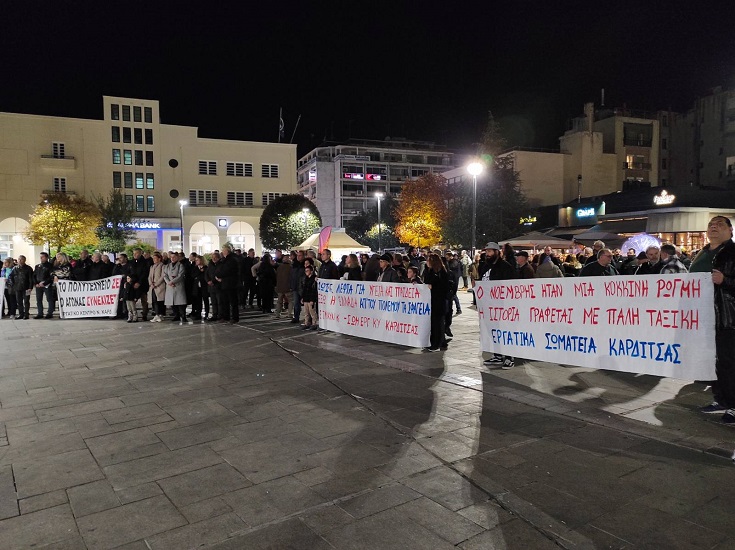 Στη συνέχεια στην κεντρική πλατεία της Καρδίτσας πραγματοποιήθηκε κοινή συγκέντρωση και πορεία σε κεντρικούς δρόμους της Καρδίτσας με τη συμμετοχή του Εργατικού Κέντρου, του Ν.Τ. της ΑΔΕΔΥ, του σωματείου εμποροϋπαλλήλων, συνδικαλιστικών οργάνων, εκπ/κών, φοιτητών, συλλόγων γυναικών, συνδικάτων, σωματείων εργαζομένων και φορέων.