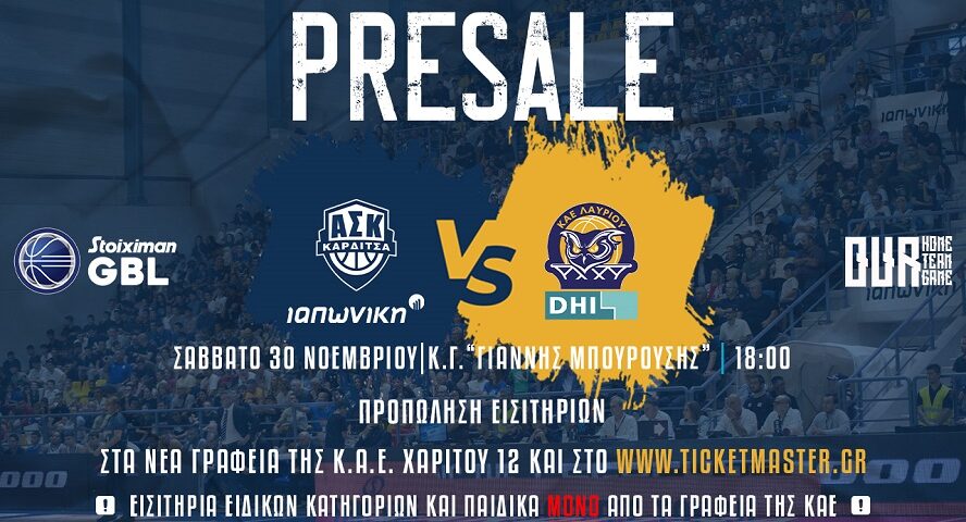 Στη διάθεση των φιλάθλων είναι από την Τετάρτη 20 Νοεμβρίου τα εισιτήρια του πολύ σημαντικού αγώνα που δίνει το Σάββατο 30 Νοεμβρίου στις 6 μ.μ. ο Α.Σ.Καρδίτσας ΙΑΠΩΝΙΚΗ, ο οποίος υποδέχεται στην έδρα του το Λαύριο DHI.