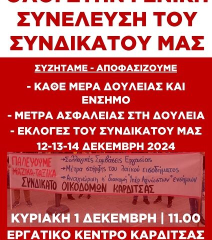 Όλοι στη Γενική μας Συνέλευση την Κυριακή 1 Δεκέμβρη στις 11πμ στο Εργατικό Κέντρο Καρδίτσας.