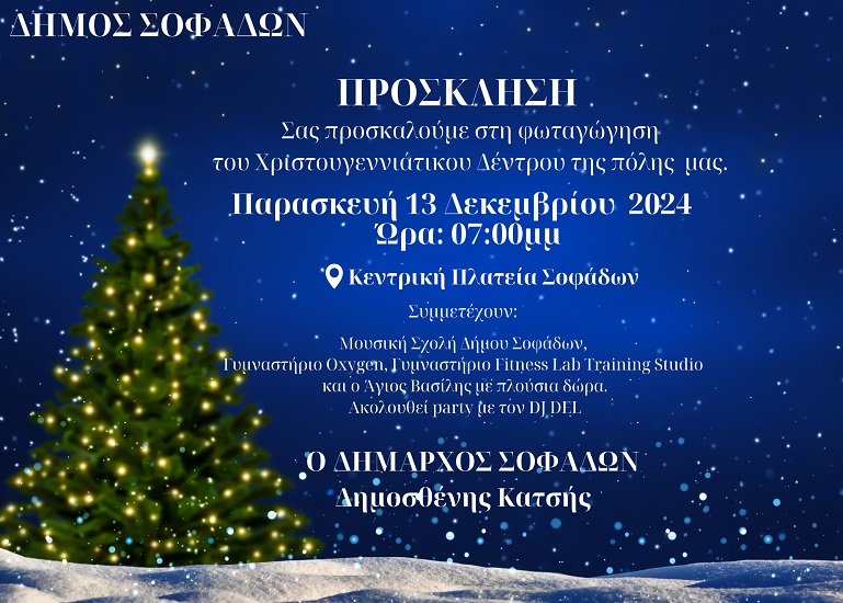 Ο Δήμος Σοφάδων διοργανώνει μια λαμπερή γιορτή για τη φωταγώγηση του Χριστουγεννιάτικου Δέντρου, που θα πραγματοποιηθεί την Παρασκευή 13 Δεκεμβρίου 2024, στις 7:00 μ.μ., στην Κεντρική Πλατεία της πόλης. Η εκδήλωση υπόσχεται να γεμίσει τη βραδιά με φως, χαμόγελα και χριστουγεννιάτικη μαγεία, εγκαινιάζοντας την εορταστική περίοδο με τον πιο εντυπωσιακό τρόπο. Η πλατεία των Σοφάδων θα μετατραπεί σε ένα μαγικό Χριστουγεννιάτικο Χωριό , με ξύλινα σπιτάκια που θα φιλοξενήσουν κάποιες από τις δράσεις του Δήμου και των Συλλόγων της πόλης. Ξεχωριστή θέση θα έχει το Σπίτι του Άη Βασίλη , όπου τα παιδιά θα μπορούν να συναντήσουν τον αγαπημένο τους Άγιο και να παραλάβουν το δώρο τους, καθώς και το Ταχυδρομείο του Αη Βασίλη , όπου οι μικροί μας φίλοι μπορούν να στείλουν τα γράμματα τους με τις επιθυμίες και τις ευχές τους. Το πρόγραμμα της εκδήλωσης: