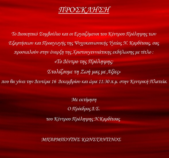 Τη Δευτέρα 16 -12-2024 στις 11.30 π.μ στο χώρο της Κεντρικής Πλατείας θα πραγματοποιηθεί η επίσημη έναρξη της χριστουγεννιάτικης δραστηριότητα που διοργανώνει το Κέντρο Πρόληψης των Εξαρτήσεων και Προαγωγής της Ψυχοκοινωνικής Υγείας Ν. Καρδίτσας σε συνεργασία με τον ΟΚΑΝΑ με τίτλο: «Το δέντρο της Πρόληψης: Στολίζουμε τη Ζωή μας με Αξίες».