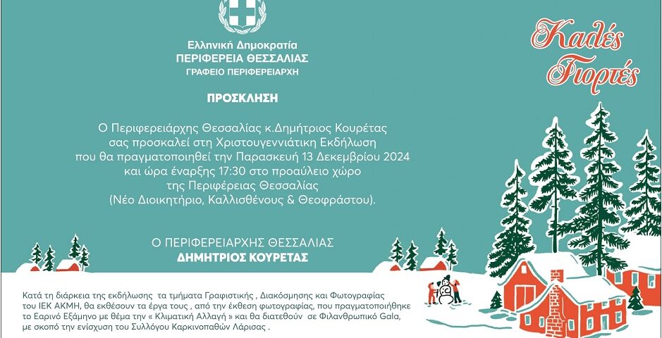Στα γιορτινά του θα ντυθεί στις 5.30 το απόγευμα της Παρασκευής 13 Δεκεμβρίου το κτίριο της Περιφέρειας Θεσσαλίας στη Λάρισα (Καλλισθένους & Θεοφράστου), όπου θα πραγματοποιηθεί μία μεγάλη γιορτή ενόψει των Χριστουγέννων, που θα κορυφωθεί με το άναμμα του Χριστουγεννιάτικου δέντρου από τον Περιφερειάρχη Θεσσαλίας, κ.Δημήτρη Κουρέτα. Η εκδήλωση είναι ανοιχτή στο ευρύ κοινό και περιλαμβάνει δρώμενα για μικρούς και μεγάλους προσαρμοσμένα στο πνεύμα των ημερών, με στόχο να γεμίσουν τις καρδιές με χαρά και αισιοδοξία ενώ θα μοιραστούν και δώρα σε όλα τα παιδιά. Στο πλαίσιο της εκδήλωσης, τα τμήματα Γραφιστικής, Διακόσμησης και Φωτογραφίας του ΙΕΚ ΑΚΜΗ θα εκθέσουν έργα τους από την έκθεση φωτογραφίας που πραγματοποιήθηκε με θέμα «Κλιματική Αλλαγή» και τα έσοδα θα διατεθούν σε φιλανθρωπικό Gala με σκοπό την ενίσχυση του Συλλόγου Καρκινοπαθών Λάρισας.