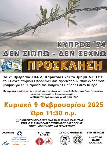 Το 2ο Ημερήσιο ΕΠΑ.Λ. Καρδίτσας, σε συνεργασία με το Τμήμα Δασολογίας, Επιστημών Ξύλου & Σχεδιασμού (Δ.Ε.ΞΥ.Σ.) του Πανεπιστημίου Θεσσαλίας, διοργανώνει επετειακή εκδήλωση μνήμης αφιερωμένη στη συμπλήρωση 50 ετών από την τουρκική εισβολή στην Κύπρο.