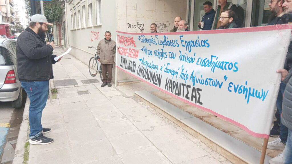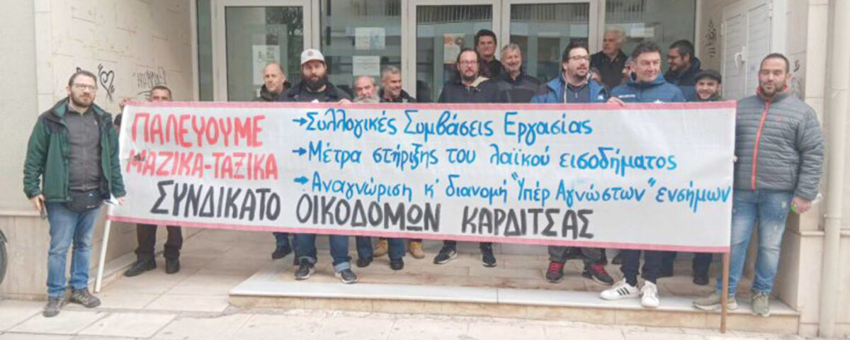 Στο πλαίσιο της 48ωρης πανελλαδικής πανοικοδομικής απεργίας, οικοδόμοι της Καρδίτσας πραγματοποίησαν έξω από το εργατικό κέντρο απεργιακή συγκέντρωση, με αιτήματα την υπογραφή νέας συλλογικής σύμβασης εργασίας με ουσιαστικές αυξήσεις, αναγνώριση και διανομή των “υπέρ αγνώστων” ενσήμων και να ληφθούν μέτρα υγείας και ασφάλειας στους χώρους της δουλειάς.