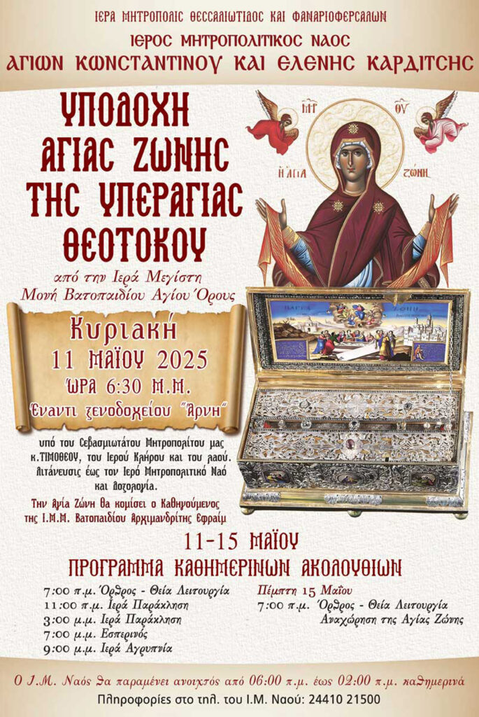 Η Ιερά Μητρόπολη Θεσσαλιώτιδος και Φαναριοφερσάλων ανακοινώνει ότι, την Κυριακή 11 Μαΐου 2025 και ώρα 6:30΄μ.μ., ο Σεβασμιώτατος Μητροπολίτης μας κ. Τιμόθεος, επικεφαλής του ιερού Κλήρου και του ευσεβούς λαού, θα υποδεχθεί την Αγία Ζώνη της Παναγίας μας έναντι του Ξενοδοχείου ΑΡΝΗ, (είσοδος Κεντρικής Πλατείας) πόλεως Καρδίτσας, την οποία θα κομίσει ο Πανοσιολογιώτατος Αρχιμανδρίτης Γέρων Εφραίμ, Καθηγούμενος της Ιεράς Μεγίστης Μονής Βατοπαιδίου.
