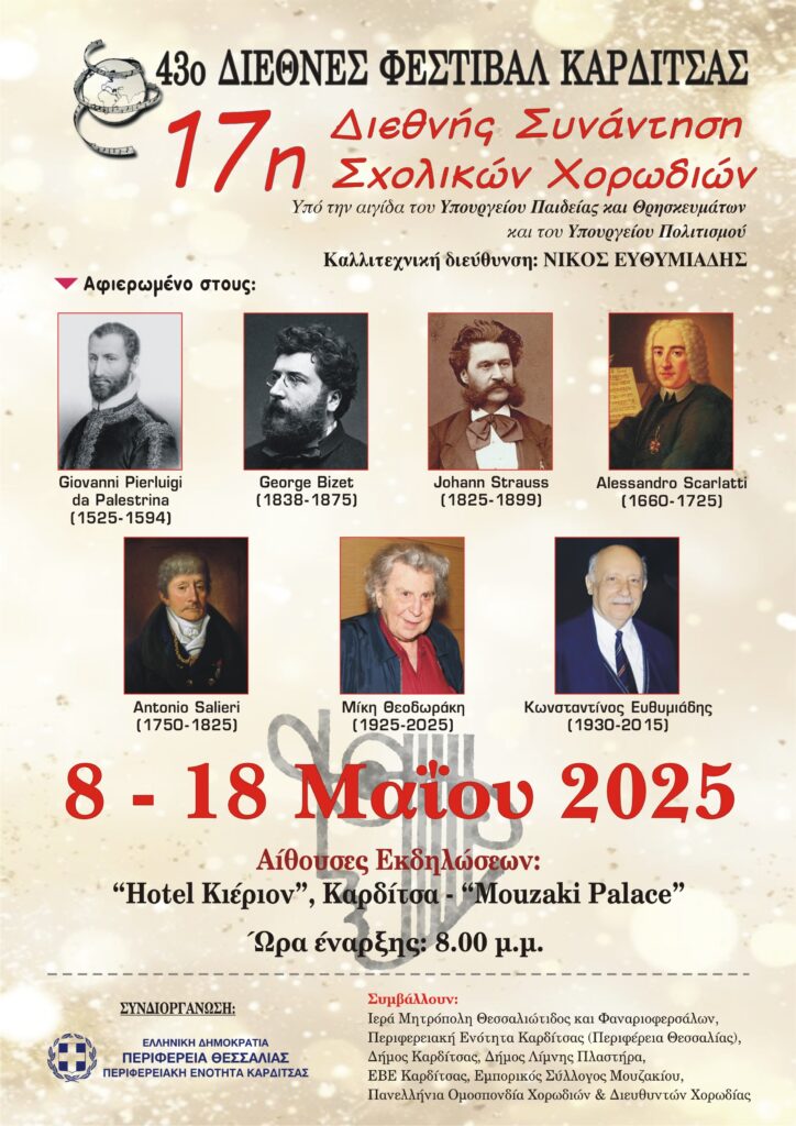 Το 43ο Διεθνές Φεστιβάλ Καρδίτσας, που θα πραγματοποιηθεί από την Πέμπτη 8 έως την Κυριακή 25 Μαϊου 2025 είναι αφιερωμένο στους Μίκη Θεοδωράκη, Giovanni Pierluigi da Palestrina, George Bizet, Αlessandro Scarlati, Antonio Salieri και στον Κωνσταντίνο Ευθυμιάδη.