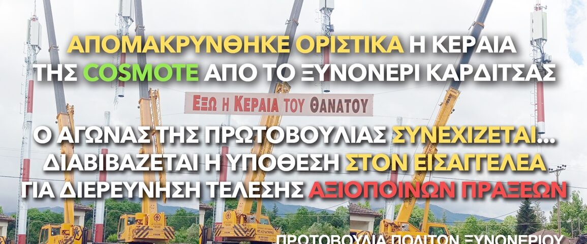Σήμερα με την οριστική απομάκρυνση της κεραίας, έχοντας τηρήσει μέχρι κεραίας τις υποσχέσεις μας, δηλώνουμε ότι ο αγώνας δεν σταματά εδώ: παραμένουμε σε εγρήγορση και παρακολουθούμε στενά τις εξελίξεις των ερευνών του Εισαγγελέα αναφορικά στην τέλεση αξιόποινων πράξεων σχετικά με την υπόθεση, ζήτημα για το οποίο θα σας κρατούμε ενήμερους. Αντίστοιχη διερεύνηση διοικητικά αξιόποινων πράξεων σε φορείς που εμπλέκονται με την εν λόγω «αδειοδότηση» της εγκατάστασης πρέπει να γίνει και σε πολιτικό επίπεδο και αναμένουμε για αρχή από τους αιρετούς της Τοπικής Κοινότητας Ξυνονερίου και του Δήμου Καρδίτσας να πράξουν τα δέοντα.