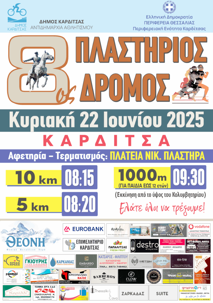 Στην Καρδίτσα θα πραγματοποιηθεί την Κυριακή 22/6 ο 8oς Πλαστήριος δρόμος, ένα αθλητικό γεγονός αφιερωμένο στη μνήμη του Νικολάου Πλαστήρα και διοργανώνεται από το Δήμο Καρδίτσας – Αντιδημαρχία Αθλητισμού, σε συνδιοργάνωση με την Περιφέρεια Θεσσαλίας – Περιφερειακή Ενότητα Καρδίτσας, τη συνδρομή του Τμήματος Τροχαίας Καρδίτσας και τη συνεργασία των Αθλητικών Συλλόγων Καρδίτσας, ”Φωκιανός”, ”Ωρίων” και Σύλλογος Δρομέων Καρδίτσας, τοπικό τμήμα Ερυθρού Σταυρού και το Σύλλογο Αιμοδοτών Καρδίτσας.