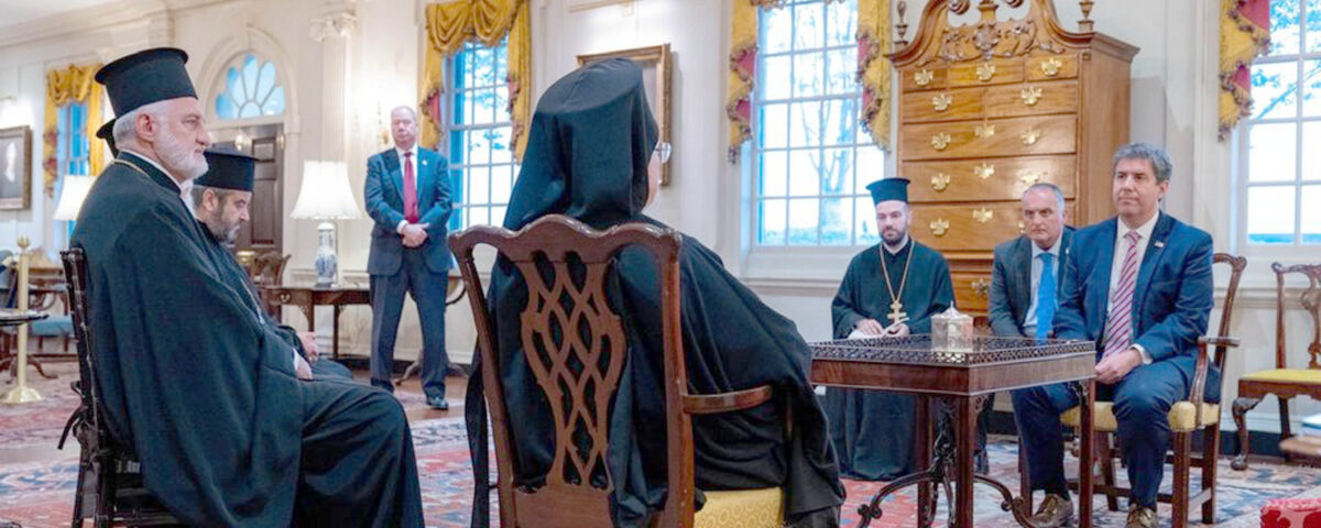 Λίγες ώρες μετά την κατάθεση στεφάνου στο επιβλητικό μνημείο του Κοιμητηρίου του Άρλινγκτον, ο προκαθήμενος της Ορθοδοξίας συνοδευόμενος από τον Αρχιεπίσκοπο Αμερικής Ελπιδοφόρο βρέθηκε στο αμερικανικό υπουργείο Εξωτερικών. Στον σύντομο χαιρετισμό του ευχαρίστησε θερμά τον αναπληρωτή ΥΠΕΞ, ομογενή Μάικλ Ρήγα, που ήταν ο οικοδεσπότης της βραδιάς, για τη φιλοξενία στο κτίριο με το βαρύ ιστορικό αποτύπωμα.