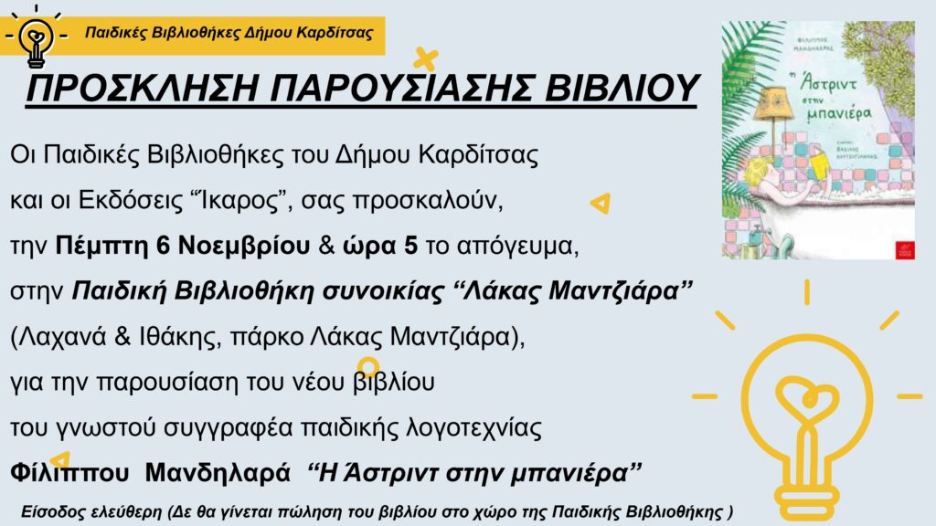 Ο καταξιωμένος, πολυγραφότατος και πολύ αγαπητός, σε μικρούς και μεγάλους, συγγραφέας παιδικής λογοτεχνίας Φίλιππος Μανδηλαράς, θα επισκεφτεί την Καρδίτσα!!!