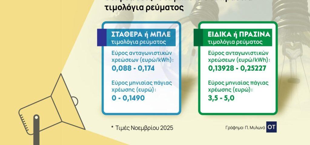 Σύμφωνα με τα στοιχεία που δημοσιεύει η Ρυθμιστική Αρχή Αποβλήτων Ενέργειας και Υδάτων (ΡΑΑΕΥ) για τις χρεώσεις των παρόχων ρεύματος, τον Νοέμβριο οι ανταγωνιστικές χρεώσεις στα ειδικά ή πράσινα τιμολόγια ρεύματος κυμαίνονταν από 0,13298 έως 0,25277 ευρώ/kWh (κιλοβατώρα). Και το εύρος της μηνιαίας πάγιας χρέωσης (πάγιο) ήταν από τα 3,5 έως τα 5 ευρώ.