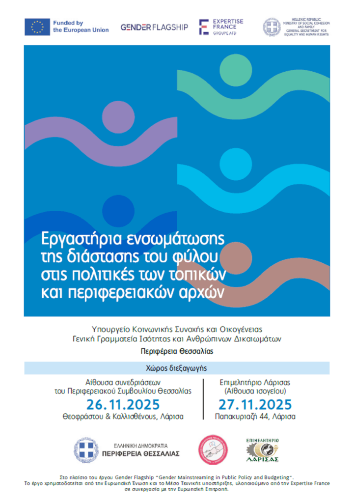 Η Περιφέρεια Θεσσαλίας, σε συνεργασία με το Υπουργείο Κοινωνικής Συνοχής και Οικογένειας και τη Γενική Γραμματεία Ισότητας και Ανθρωπίνων Δικαιωμάτων, διοργανώνει διήμερα εργαστήρια με τίτλο «Εργαστήρια ενσωμάτωσης της διάστασης του φύλου στις πολιτικές και στους προϋπολογισμούς της τοπικής αυτοδιοίκησης». Η εκδήλωση πραγματοποιείται στο πλαίσιο του έργου Gender Flagship , το οποίο χρηματοδοτείται από την Ευρωπαϊκή Ένωση.