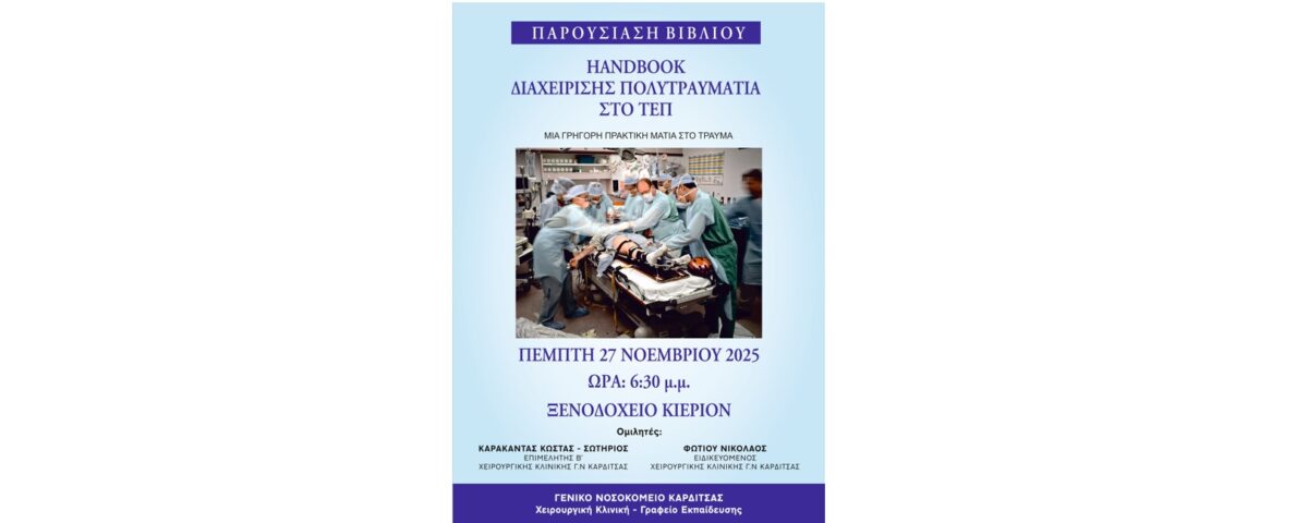 Η εκδήλωση θα πραγματοποιηθεί την Πέμπτη 27 Νοεμβρίου, στις 6:30 μ.μ., στο Ξενοδοχείο Κιέριον. Στην παρουσίαση θα συμμετέχουν οι συγγραφείς,, επιστημονικοί συνεργάτες καθώς και επαγγελματίες υγείας από διαφορετικές ειδικότητες, οι οποίοι θα συζητήσουν για τις προκλήσεις και τις βέλτιστες πρακτικές στη διαχείριση πολυτραυματιών στο Τμήμα Επειγόντων περιστατικών.