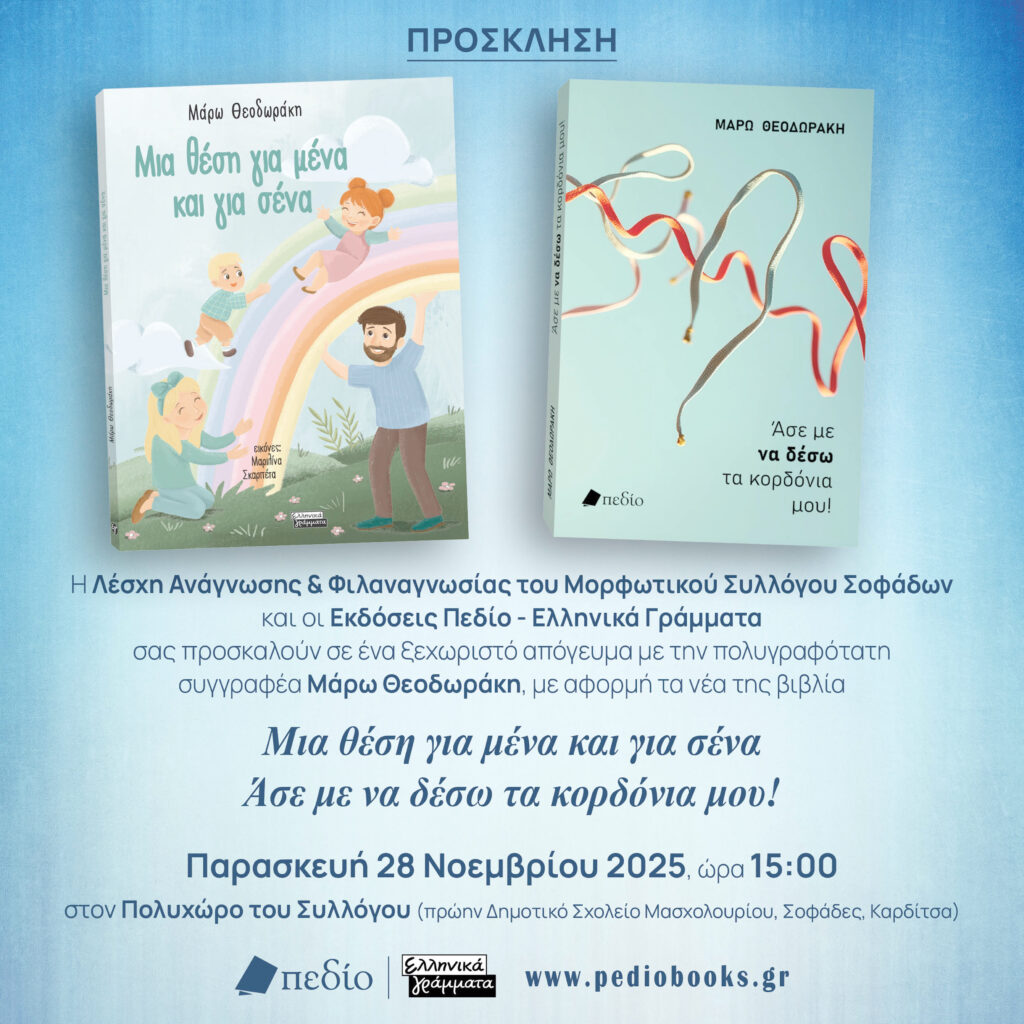 Την πολυγραφότατη και πολυβραβευμένη συγγραφέα Μάρω Θεοδωράκη υποδέχεται η Λέσχη Ανάγνωσης και Φιλαναγνωσίας του Μορφωτικού Συλλόγου Σοφάδων την Παρασκευή 28 Νοεμβρίου 2025 στις 4μ.μ. στον Πολυχώρο του Συλλόγου (πρώην Δημοτικό Σχολείο Μοσχολουρίου) σε ένα ξεχωριστό απόγευμα με αφορμή τα νέα της βιβλία :