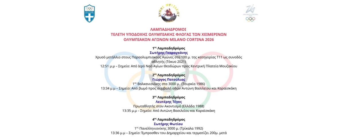 Ο Δήμαρχος Μουζακίου σας προσκαλεί στην Τελετή Υποδοχής της Ολυμπιακής Φλόγας των Χειμερινών Ολυμπιακών Αγώνων Milano Cortina 2026, που θα πραγματοποιηθεί την Παρασκευή 28 Νοεμβρίου 2025 στο Μουζάκι.