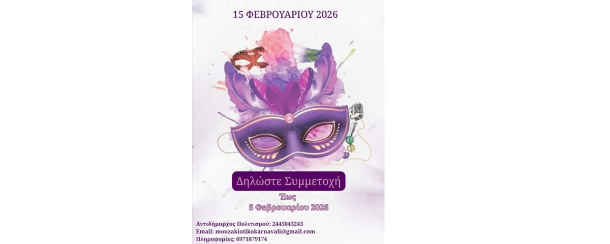 Την Κυριακή 15 Φεβρουαρίου 2026 ο Δήμος Μουζακίου διοργανώνει το 4ο Μουζακιώτικο Καρναβάλι και σας προσκαλεί να συμμετέχετε στη μεγάλη αποκριάτικη γιορτή της πόλης μας!