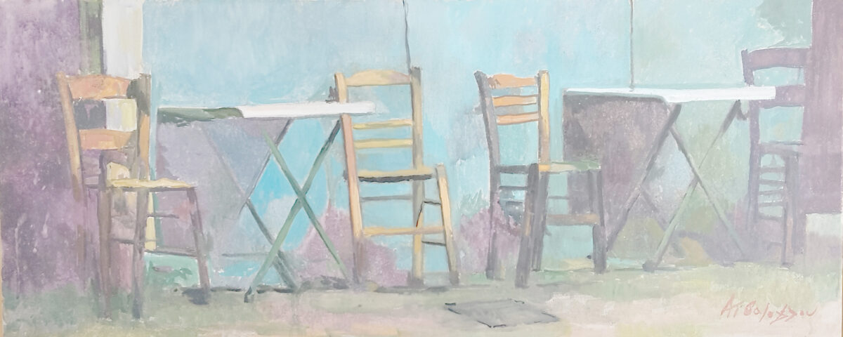 Ο Αχιλλέας Αϊβάζογλου υπηρετεί μια αισθαντική ζωγραφική. Ένα βλέμμα που περιπλανιέται στον χώρο κι εντοπίζει σημεία ενδιαφέροντος. Στο έργο: ‘παλιό καφενείο’ συναντώνται η τρυφερότητα του άνθρωπου που βλέπει, η παρουσία αυτού που παρατηρείται, η επίγευση της προσωπικής εμπειρίας και μαζί η καλά εξασκημένη τεχνική διαπραγμάτευση του δημιουργού. Τοπία της πόλης όπου σκηνογραφούνται στιγμές της καθημερινότητάς μας. Ο καλλιτέχνης αξιοποιεί τη δύναμη του χρώματος και την καθαρότητα του σχεδίου. Δημιουργεί ευρύχωρες χρωματικές περιοχές που εναλλάσσονται και αλληλοσυμπληρώνονται, έτσι καθώς ενοποιούνται τα αποδιδόμενα αντικείμενα, οι σκιές και ο χώρος που τα περιέχει. Εφαρμόζει αυστηρή παρατακτική δομή, τάξη και ρεαλιστική απεικόνιση που εν μέρει αίρεται από την αταξία που δημιουργεί η πατίνα του χρόνου. Το τελικό αποτέλεσμα είναι μια ατμοσφαιρική συνθήκη, παραστατική, γήινη και έντονα φορτισμένη από ζωή, αλλά και από την παροδικότητά της: τα πραγματολογικά στοιχεία, η εμπειρία, η οικειότητα, η φυσική φθορά, οι μνήμες και η νοσταλγία συμμετέχουν ταυτόχρονα και υποβάλλονται από τους ιδιαίτερους χρωματικούς τόνους που πλάθουν τα αναπαριστώμενα. Οι χειρονομίες του καλλιτέχνη, οι καταγραφές και οι αποσιωπήσεις του – όλα υπομνηματίζουν την ανθρώπινη παρουσία και / ή απουσία, το βίωμα, την προσωπική εμπλοκή, την ενδοσκόπηση και τα συναισθηματικά φορτία από το μικρο-κλίμα και τη ζωή της πόλης. Το έργο: ‘παλιό καφενείο’, όπως και τα υπόλοιπα έργα του καλλιτέχνη, προσφέρει απόψεις της καθημερινότητας, του σύγχρονου βίου ιδιαίτερα της πόλης. Εντάσσεται στην εικαστική συλλογή της ΔΠΚ, έτοιμο να ενεργοποιήσει συνομιλίες σε ενδεχόμενα μουσειολογικά σενάρια.