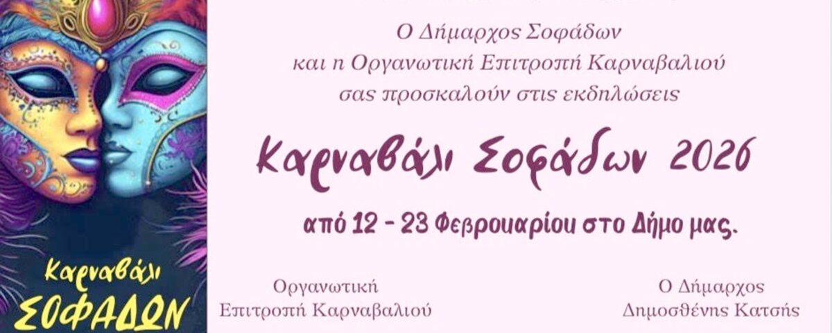 Ο Δήμος Σοφάδων καλεί δημότες και επισκέπτες να συμμετάσχουν ενεργά, να φορέσουν τη στολή τους και να γίνουν μέρος μιας μεγάλης συλλογικής εμπειρίας χαράς, κεφιού και αισιοδοξίας.