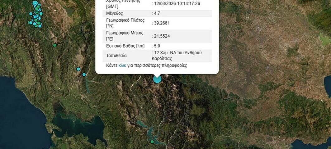 Σεισμός μεγέθους 4,8 βαθμών της κλίμακας Ρίχτερ, καταγράφηκε την Πέμπτη 12-3-2026, στις 12:14 μμ, ο οποίος έγινε ιδιαίτερα αισθητός στον Δήμο Αργιθέας, σε όλο το Νομό Καρδίτσας, γενικότερα στη Δυτική Θεσσαλία και στην Ευρυτανία.