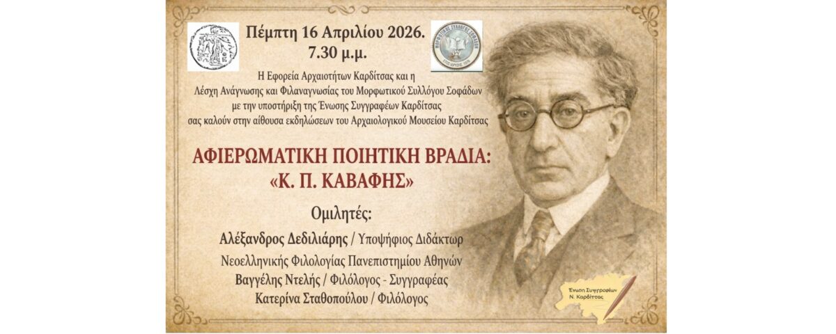 Αφιέρωμα στην ποίηση του Κ. Π. Καβάφη διοργανώνουν η Εφορεία Αρχαιοτήτων Καρδίτσας και η Λέσχη Ανάγνωσης και Φιλαναγνωσίας του Μορφωτικού Συλλόγου Σοφάδων με την υποστήριξη της Ένωσης Συγγραφέων Καρδίτσας την Πέμπτη 16 Απριλίου 2026 στις 7.30μ.μ στην αίθουσα εκδηλώσεων του Αρχαιολογικού Μουσείου Καρδίτσας.