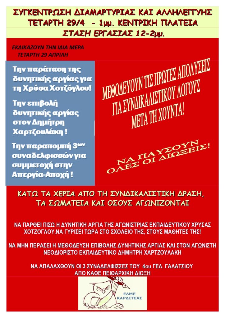 Αυτό που κρίνεται στις 29/4 είναι αν θα περάσουν οι πρώτες απολύσεις στο Δημόσιο για συνδικαλιστική δράση μετά τη χούντα ή αν ο κλάδος θα τις ανατρέψει στην πράξη! Δηλαδή, αν θα αλλάξει συθέμελα η δουλειά μας, αν θα έχουμε δικαίωμα να αγωνιζόμαστε, αν θα έχουμε δικαίωμα να μιλάμε ελεύθερα. Μπροστά μας έχουμε μια μάχη που πρέπει να δοθεί μαζικά και αποφασιστικά.