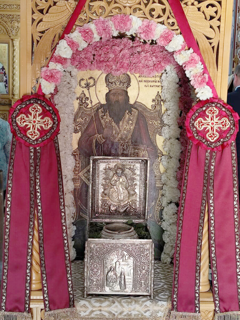 Στις 5 το απόγευμα πραγματοποιήθηκε η μετακομιδή της τιμίας κάρας του Αγίου στον Ενοριακό Ιερό Ναό Αγίου Σεραφείμ Φαναρίου, όπου τελέσθηκε ο πανηγυρικός Αρχιερατικός Εσπερινός, χοροστατούντος του Μητροπολίτου μας κ. Τιμοθέου. Ακολούθησε προσκύνηση και δέηση στον τόπο του μαρτυρίου του Αγίου, μέσα σε κλίμα συγκίνησης και ευλάβειας.