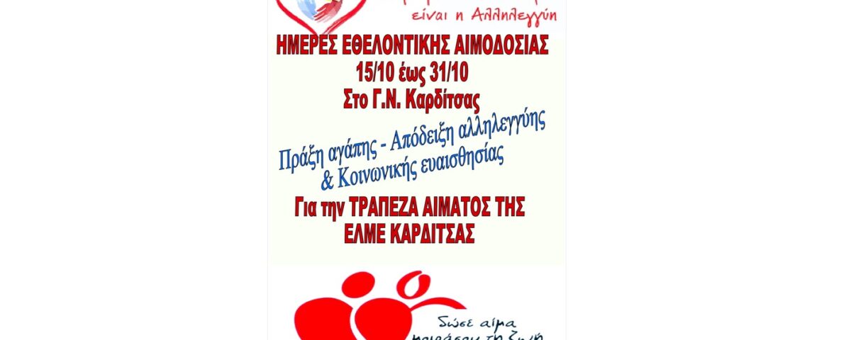 Η ΕΛΜΕ Καρδίτσας στο πλαίσιο και της κοινωνικής και ανθρωπιστικής της δράσης, οργανώνει εθελοντική αιμοδοσία, με στόχο τη συλλογή ικανού αριθμού φιαλών αίματος, για την ενίσχυση της Τράπεζας Αίματος που διατηρεί.