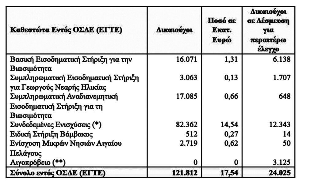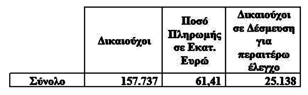 Οι πληρωμές από τον ΟΠΕΚΕΠΕ Σύμφωνα με τα προβλεπόμενα από την Ενωσιακή και της Εθνική Νομοθεσία και κατόπιν διασταυρωτικών ελέγχων με τα στοιχεία του Ε9 και των στοιχείων του myDATA από την ΑΑΔΕ, πραγματοποιούνται από σήμερα 15 Οκτωβρίου 2025, πληρωμές σε συνολικά 157.737 δικαιούχους, συνολικού ποσού 61,41 εκατ. ευρώ, ενώ οι αιτήσεις 25.138 δικαιούχων (ήτοι ποσοστό 13,7% επί του συνόλου των 182.875 δικαιούχων) δεσμεύτηκαν για περαιτέρω έλεγχο. Πέραν των ανωτέρω ποσών, από 01.09.2025 έχουν καταβληθεί επιπλέον 90 εκατ. ευρώ περίπου σε δικαιούχους διαφόρων Επενδυτικών Μέτρων του ΠΑΑ 2014 – 2022. Επομένως, λαμβάνοντας υπόψη και την πληρωμή ύψους 1,6 εκατ. ευρώ που έγινε στις 03.10.2025, συνολικά από 01.09.2025 έχουν πληρωθεί 153 εκατ. ευρώ. Στα ποσά αυτά, δεν περιλαμβάνονται οι αιτήσεις των υποψηφίων δικαιούχων που ελέγχονται από τη Διεύθυνση Αντιμετώπισης Οργανωμένου Εγκλήματος.