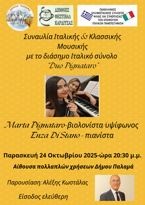 Ο Δήμος Παλαμά, σε συνεργασία με τον Πανελλήνιο Ελληνοϊταλικό Σύλλογο Φιλίας & Συνεργασίας Αποφοίτων Ιταλικών Πανεπιστημίων και το Διεθνές Φεστιβάλ Καρδίτσας, έχουν τη χαρά να ανακοινώσουν τη διοργάνωση μιας ξεχωριστής Συναυλίας Κλασικής & Ιταλικής Μουσικής με το διακεκριμένο Ιταλικό “Duo Pignataro”.