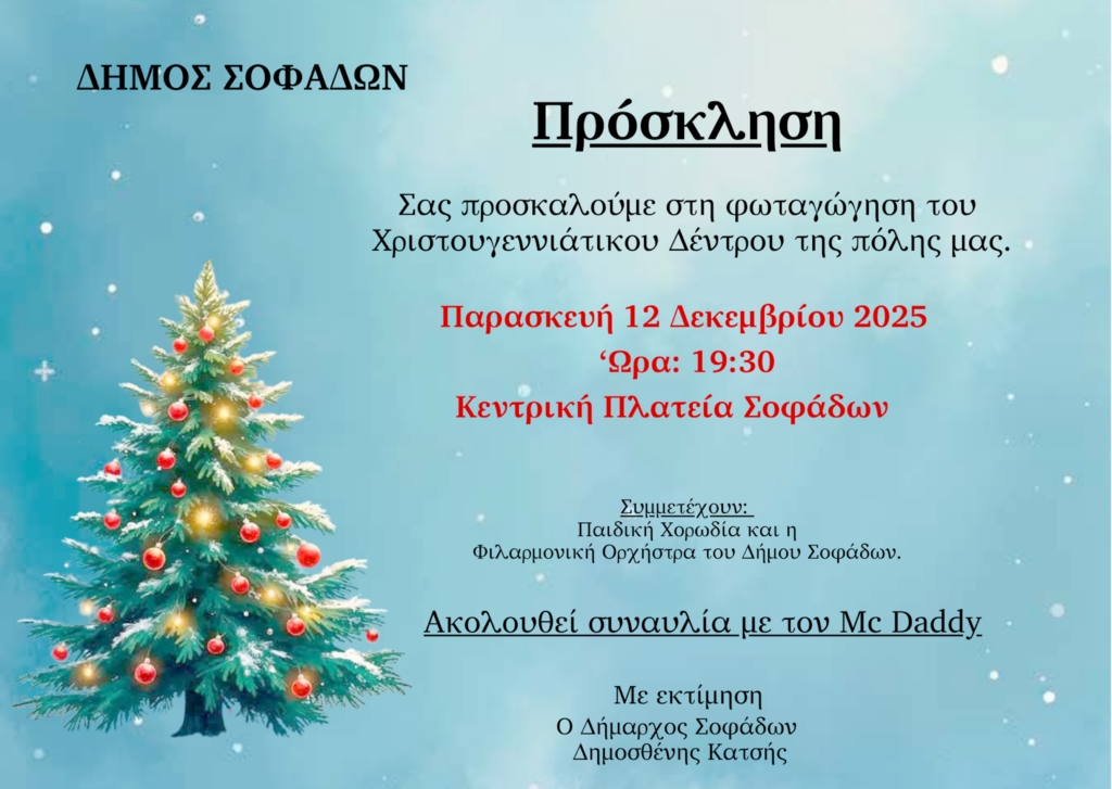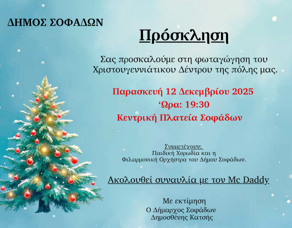 Παρασκευή 12 Δεκεμβρίου 2025 – 19:30Κεντρική Πλατεία ΣοφάδωνΟι γιορτές ξεκινούν