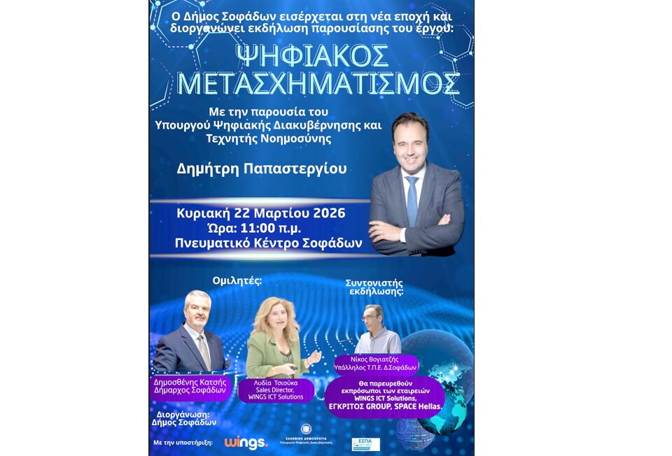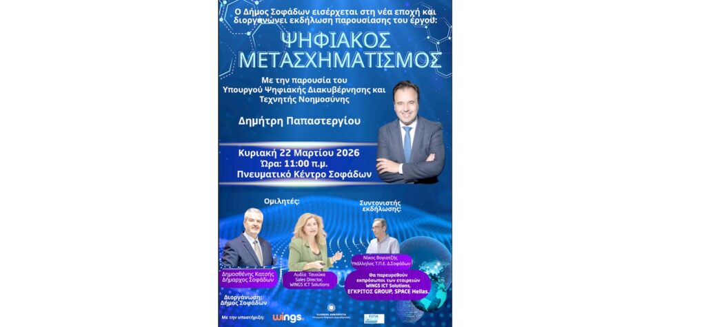Ο Δήμος Σοφάδων και η WINGS ICT Solutions παρουσιάζουν το έργο: «Ευφυείς εφαρμογές και δράσεις στο πλαίσιο του Ψηφιακού Μετασχηματισμού του Δήμου Σοφάδων»